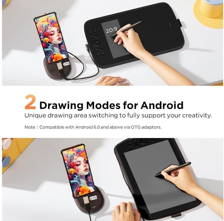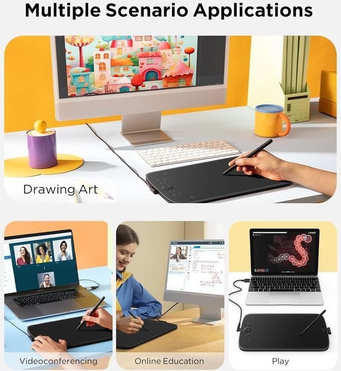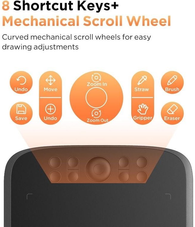 Stylus má ľahký a ergonomický dizajn doplnený programovateľnými tlačidlami, vďaka čomu je jeho používanie plynulé a pohodlné. Táto konštrukcia minimalizuje odchýlky a vibrácie a umožňuje úplnú kontrolu nad presnosťou čiar. Zažite úplne plynulú prevádzku. Tablet je vybavený funkčným mechanizmom rolovacieho kolieska, ktorý umožňuje presné úpravy veľkosti pracovnej plochy alebo iných nastavení. Okrem toho obsahuje osem praktických klávesových skratiek, ktoré poskytujú okamžitý prístup k základným a často používaným funkciám, čím zabezpečujú jednoduchú navigáciu a intuitívne nastavenie.Kompatibilita a kreativita
