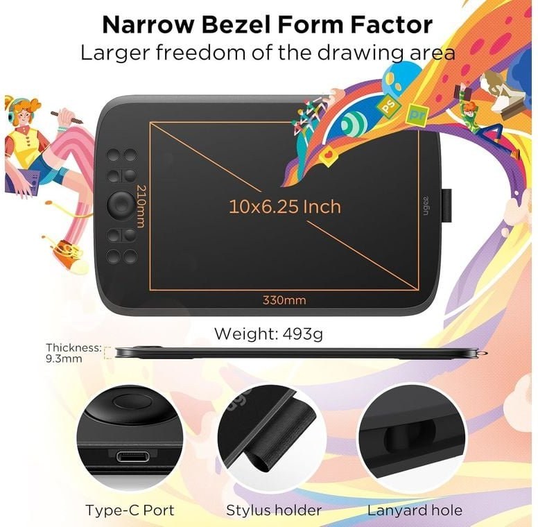 Zbavte sa starostí s kompatibilitou. Ugee M908 je kompatibilný so všetkými hlavnými operačnými systémami vrátane Windows, macOS, Android a Chrome, čo uľahčuje kreativitu na rôznych platformách. Či už používate Photoshop, Sai, Illustrator alebo inú grafickú aplikáciu,M908 sa ľahko integruje s vaším preferovaným softvérom. Jeho minimalistický dizajn v kombinácii s modernou estetikou je skutočne pôsobivý. „Sendvičový“ dizajn so zaoblenými hranami nielen zvyšuje vizuálnu príťažlivosť, ale prispieva aj k lepšej stabilite a odolnosti. Priestranná pracovná plocha s rozmermi 10 × 6,25 palca spolu s praktickým portom USB-C navyše zabezpečuje jednoduché používanie.Poznámka: Nadmerný tlak stylusu môže spôsobiť preliačiny alebo iné poškodenie touchpadu.