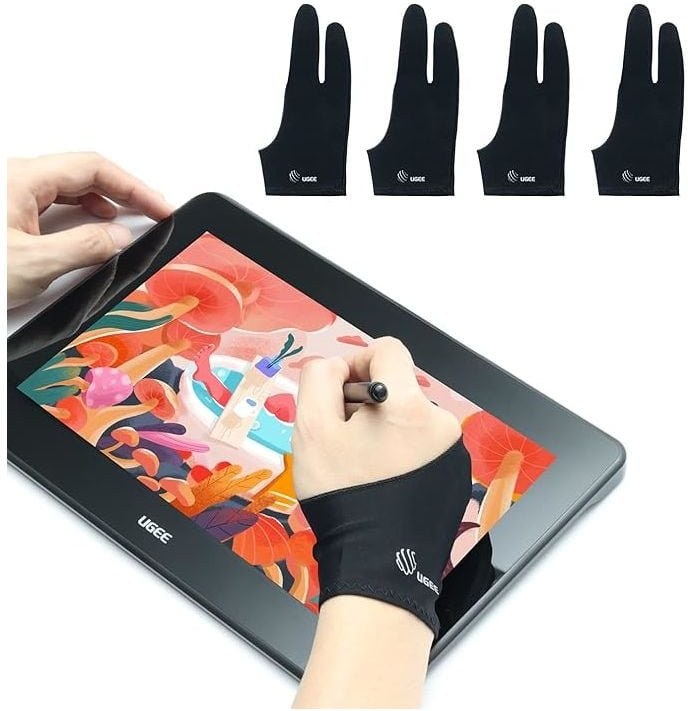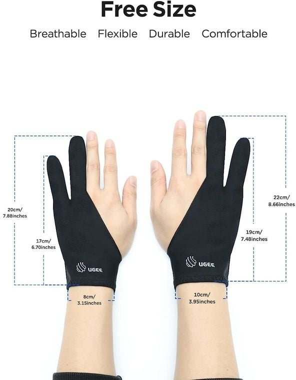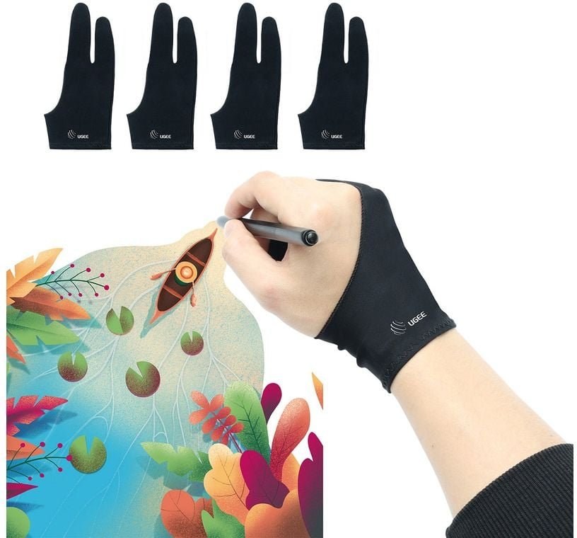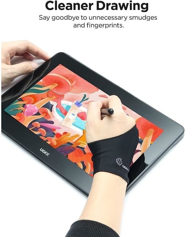 Vysokokvalitná kresliaca rukavica Ugee je určená pre umelcov, ktorým pomáha znížiť trenie rúk o kresliace tablety a eliminovať mastnotu na obrazovke. Rukavica je vhodná pre pravákov aj ľavákov a pokrýva len dva prsty na každej ruke (prstenník a malíček), ktoré sa bežne nepoužívajú na ovládanie tabletu, ale môžu s ním ľahko prísť do nežiaduceho kontaktu. Jedinečná konštrukcia s dvoma prstami umožňuje, aby sa rukavica flexibilne roztiahla a prispôsobila dlani, takže je vhodná pre väčšinu ľudí a pohodlne sa nasadzuje a vyzlieka. Používanie rukavice na digitálne kreslenie ľahko zabraňuje vzniku šmúh a škvŕn na rukách a tablete, vďaka čomu je práca s elektronickým kreslením jednoduchšia a príjemnejšia.Jednoduché nasadenie a pohodlné používanie