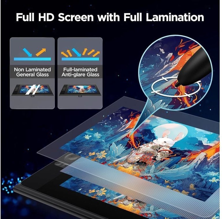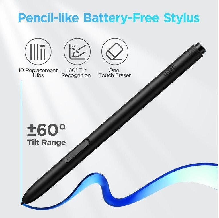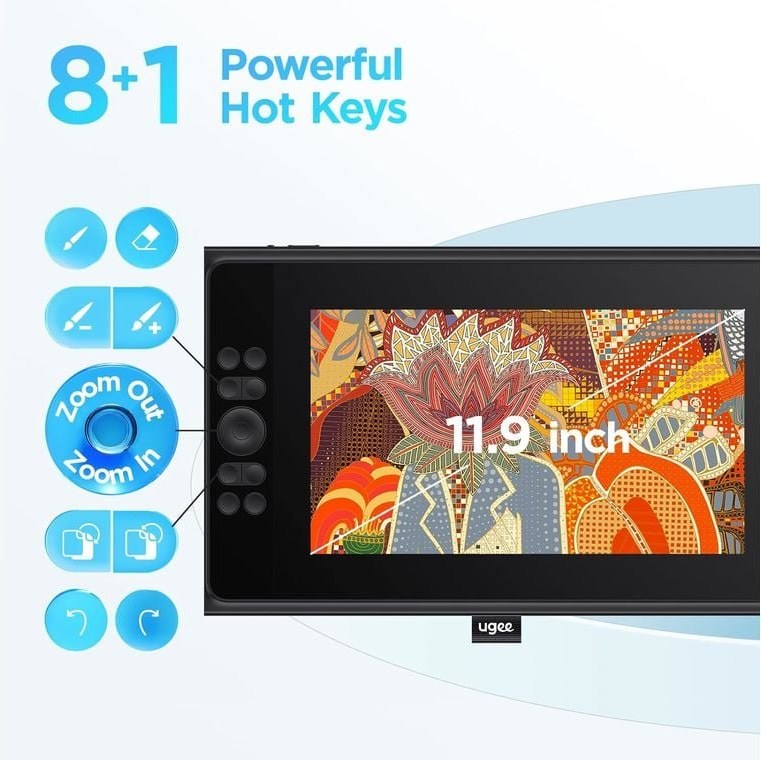 Rozlíšenie FHD (1920 × 1080) výrazne zlepšuje zreteľnosť detailných ilustrácií. Výsledkom je, že každý aspekt, od jemných čiar až po výrazné tiene, je vykreslený s presnosťou. Vďaka tomu je tento tablet vynikajúcou voľbou pre ilustrátorov, grafikov a všetkých, ktorí oceňujú ostré a živé obrázky. Ugee UE12 Plus je vybavený novým stylusom EMR, ktorý je navrhnutý s tenkým a ergonomickým profilom na plynulé a pohodlné kreslenie. Disponuje 16 000 úrovňami citlivosti na tlak, rozpoznaním sklonu 60° a umožňuje vytvárať zložité ťahy s rôznou intenzitou, čím napodobňuje autentický pocit kreslenia tradičnou ceruzkou. Integrované tlačidlo skratiek stylusu navyše uľahčuje prechod medzi funkciami pera, gumy a myši, takže je to používateľsky prívetivý nástroj aj pre začínajúcich umelcov.Dotykové klávesové skratky a rolovacie koliesko