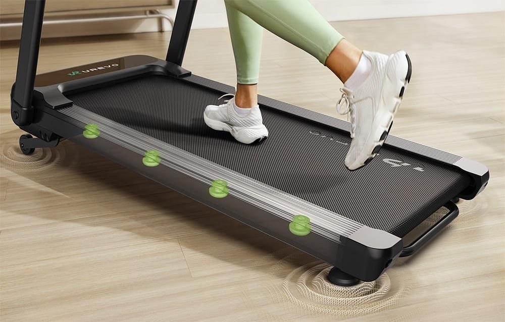 Bežecký pás UREVO Foldi 3S Smart je vybavený systémom odpruženia založeným na 8 kontaktných bodoch, ktorý znižuje zaťaženie kolien a kĺbov. Použité riešenie zlepšuje pohodlie pri cvičení a umožňuje dlhšie a bezpečné tréningy.