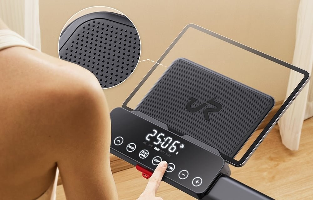 Zabudovaná silikónová protišmyková rukoväť umožňuje stabilné umiestnenie tabletu alebo smartfónu, takže počas cvičenia môžete bezpečne používať aplikáciu SmartCoach, sledovať videá alebo počúvať hudbu. Keď skončíte s cvičením, bežecký pás ľahko zložíte a vďaka mobilnému madlu - ľahko ho prestavíte alebo uskladníte.