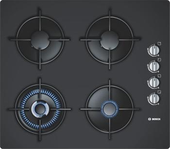 4x plynový hořák, el. jiskrové zapalování, pojistka zhasnutí plamene, ovládání vpravo, smaltované samostatné podložky, šířka 60 cm, tvrzené sklo - černé, bez rámečkuhttp://www.bosch-home.com/sk/