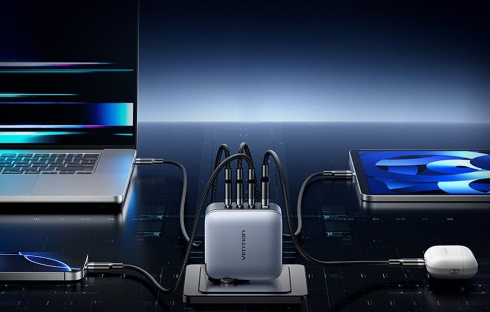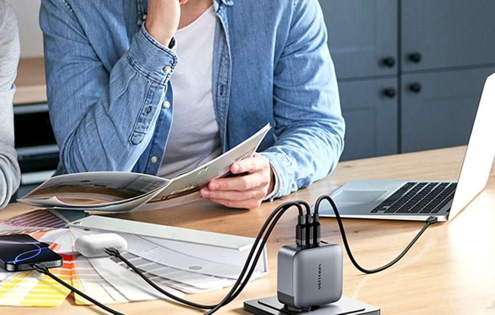 Zariadenie je vybavené štyrmi portami - 3x USB-C a jedným USB-A, ktoré umožňujú nabíjať notebook, smartfón, tablet a slúchadlá súčasne. Maximálny výkon jedného portu USB-C (C1/C2) je 100 W, zatiaľ čo porty C3 a USB-A ponúkajú až 30 W. Vďaka technológii PD 3.0 a PPS nabíjačka automaticky prispôsobuje parametre pripojenému zariadeniu. Napríklad - pri plnom zaťažení štyroch portov je rozloženie výkonu nasledovné: 40 W + 18 W + 9 W + 9 W.