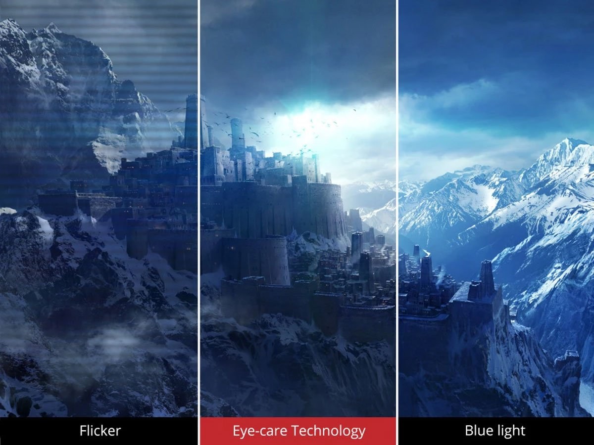Monitor je vybavený technológiou Eye-Care, ktorá pomáha eliminovať únavu očí a zároveň redukuje vyžarovanie modrého svetla. Na určitej vlnovej dĺžke modré svetlo nadmerne stimulujú sietnicu ľudského oka čím poškodzuje zrak. Tento režim tak spolu s technológiou Flicker Free, ktorá eliminuje blikanie monitora a chráni oči pred únavou. Užite si tak hranie, alebo sledovanie filmov dlhšie a pohodlnejšie.