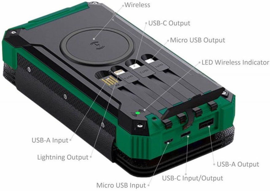 Pomocou 5-tich výstupných portov (2x USB-C, USB-A, Micro USB a Lightning) môžete dobíjať akúkoľvek drobnú elektroniku. Vďaka kapacite 16000mAh dobije Váš telefón viackrát za sebou. Na dobíjanie samotnej powerbanky sú určené 3 vstupy (USB-A, USB-C, Micro-USB)