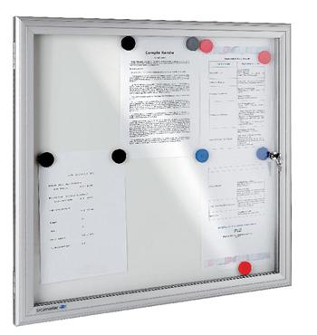 Model praktických a vodeodolných uzamykateľných vitrín s bielou tabuľou vo vnútri na použitie i v exteriéri. Magnetický povrch tabule vhodný na popisovanie za sucha stierateľnými popisovačmi. Dvierka z pevného skla, hliníkový rám, vnútorná hĺbka cca 25 mm. Vitríny dodávané s montážnou sadou a 1 kľúčom.Rozmery: 69x73 cm
