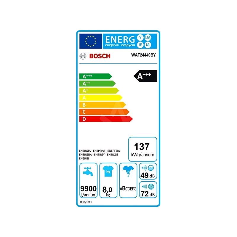 Spotreba energie: 137 kW h / rok, na základe 220 štandardných pracích cyklov s programami bavlna 60 ° C a 40 ° C s celou a polovičnou náplňou a spotreba v režimoch s nízkou spotrebou energie. Skutočná spotreba energie bude závisieť na tom,ako je spotrebič používaný.