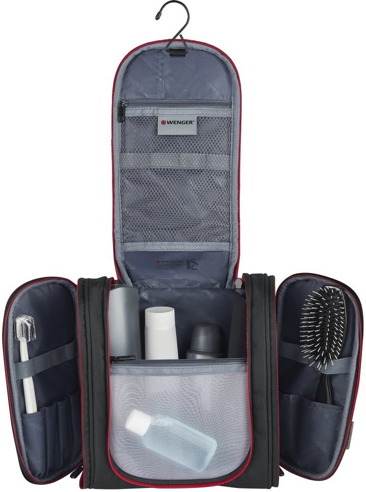 Dômyselné balenie znamená maximalizáciu priestoru a výber inovatívnej batožiny a cestovných doplnkov. Zoznámte sa s našou závesnou toaletnou sadou. Dômyselne sa organizuje, obsahuje elastické pútka na upevnenie fliaš s telovým sprchovým gélom alebo mliekom a navyše podšité vrecko na zips na vaše bežné produkty starostlivosti o pleť. Je vodeodolná so závesným háčikom a antibakteriálnou podšívkou, vďaka čomu si budete môcť udržať super svieži domov kdekoľvek na svete.Výhody produktu