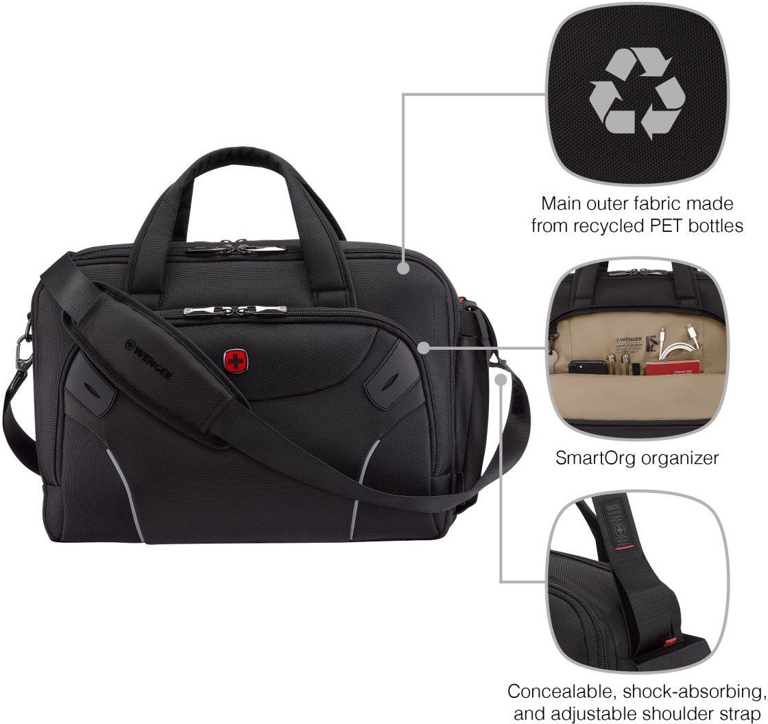 Wenger Cosmic Brief 14-16" - Štýlová a ekologická taška na notebook s vreckom na tablet. Wenger Cosmic Brief 14-16" je moderná taška navrhnutá pre každodenné profesionálne využitie. Kombinuje elegantný dizajn, praktické členenie a ekologickú výrobu z recyklovaných PET fliaš. Vďaka nastaviteľnému puzdru Triple Protect bezpečne ochráni váš notebook aj tablet, zatiaľ čo premyslené vrecká umožnia udržať prehľad v dokumentoch i príslušenstve.Kľúčové vlastnosti