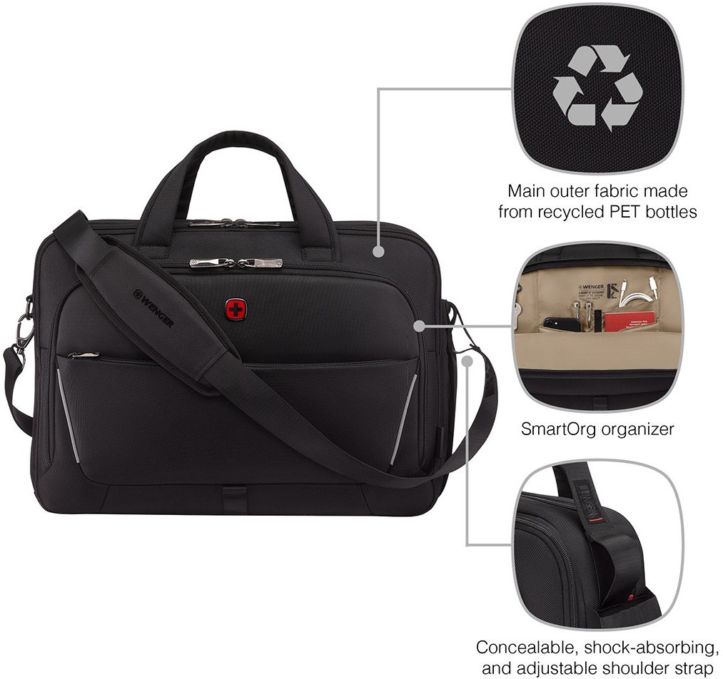 Wenger Meteor Brief 16-17" - Štýlová a odolná taška na notebook z recyklovaných materiálov.Wenger Meteor Brief 16-17" je ideálnou voľbou pre profesionálov, ktorí hľadajú štýl, funkčnosť a udržateľnosť v jednom. Vyrobená z recyklovaných PET fliaš, táto elegantná taška ponúka skvelú ochranu pre notebooky až do veľkosti 17" a tabliet, zároveň poskytuje premyslený úložný priestor pre dokumenty, nabíjačky a príslušenstvo. Vďaka praktickému dizajnu, odolnému dnu a reflexným prvkom je perfektný ako na každodenné nosenie, tak aj na služobné cesty.