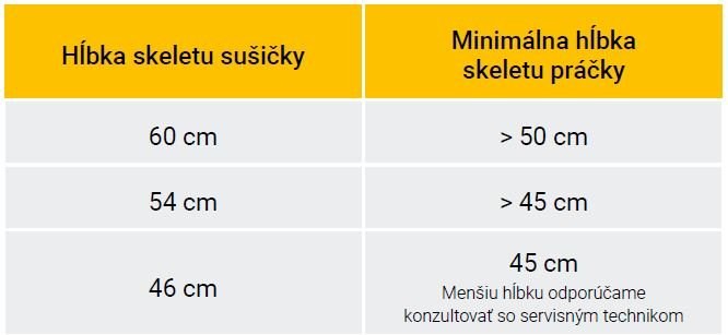 Tieto medzikusy je možné inštalovať na práčky s označením modelu, ktoré začínajú písmenami WAM alebo WPM, a na sušičky, ktoré začínajú písmenami WP, C WD, WPS alebo C WSD.Práčka a sušička môžu mať voči sebe rôznu hĺbku, je však nutné dodržať minimálnu požadovanú hĺbku skeletu práčky v závislosti od hĺbky skeletu sušičky, ako je uvedené v tabuľke.