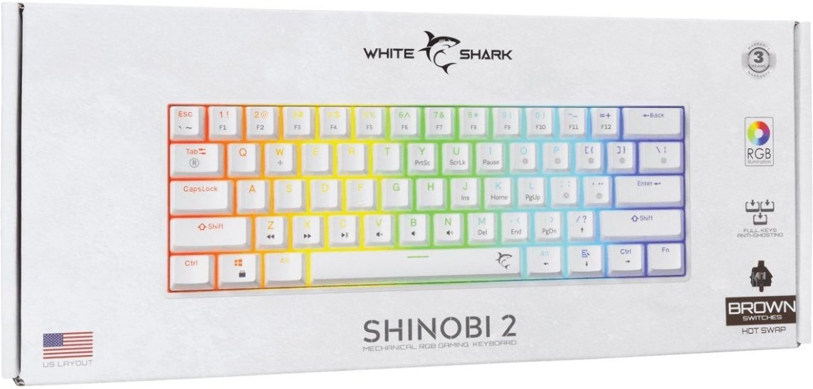 White Shark SHINOBI 2 je navrhnutá pre hráčov, ktorí vyžadujú precíznosť a kompaktnosť. 61 klávesov s plnou podporou anti-ghostingu umožní bezchybné zadávanie príkazov počas akčných momentov. Individuálne RGB podsvietenie dodáva klávesnici jedinečný vizuálny efekt a umožňuje nastavenie svetelných profilov podľa nálady alebo štýlu hrania.SHINOBI 2 White US - Brown switches