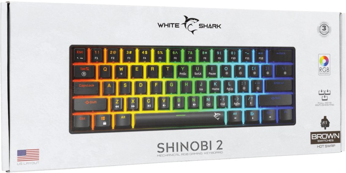 White Shark SHINOBI 2 je navrhnutá pre hráčov, ktorí vyžadujú precíznosť a kompaktnosť. 61 klávesov s plnou podporou anti-ghostingu umožní bezchybné zadávanie príkazov počas akčných momentov. Individuálne RGB podsvietenie dodáva klávesnici jedinečný vizuálny efekt a umožňuje nastavenie svetelných profilov podľa nálady alebo štýlu hrania.SHINOBI 2 Black US - Brown switches