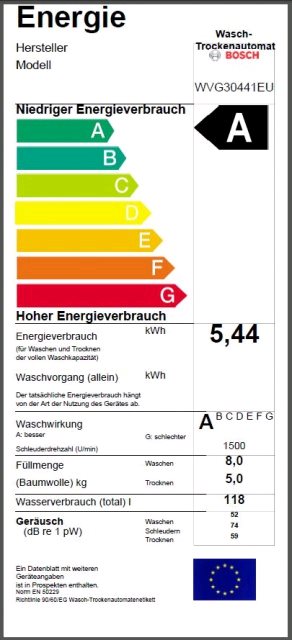 spotreba energie pranie/sušenie: 5.44 kWh, spotreba vody pranie/sušenie: 118 l