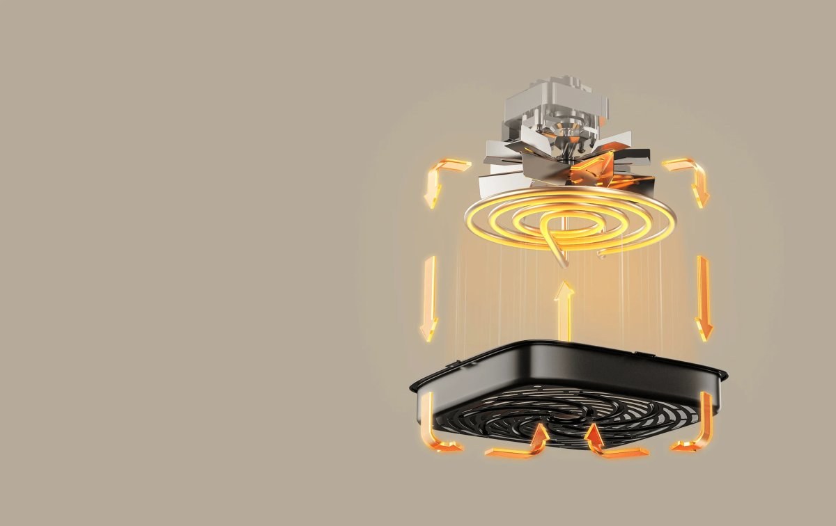 9 čepelí ventilátora s dvojitým zakončením a 3D cyklónová fritovacia platňa umožňujú 360° prúdenie vzduchu konvekčným ohrevom pre rovnomernú a chrumkavú prípravu jedla bez potreby obracania. Horúci vzduch rovnomerne cirkuluje, aby sa dosiahla rovnomerná vnútorná teplota pripravovaných pokrmov.