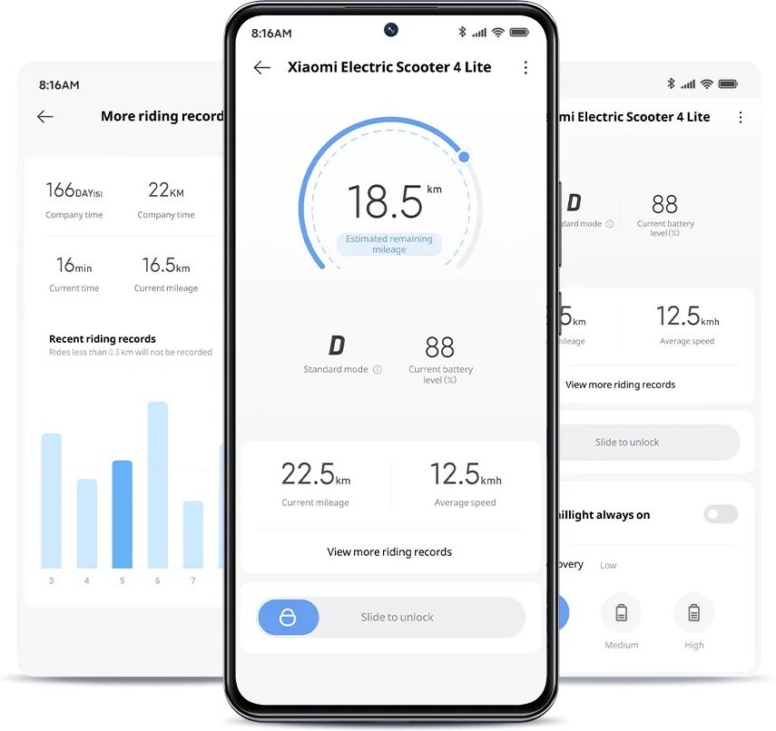 Kontrola rýchlosti jazdy a zostávajúcej batérie v reálnom čase po spárovaní kolobežky cez Bluetooth s telefónom.Duálny brzdový systém