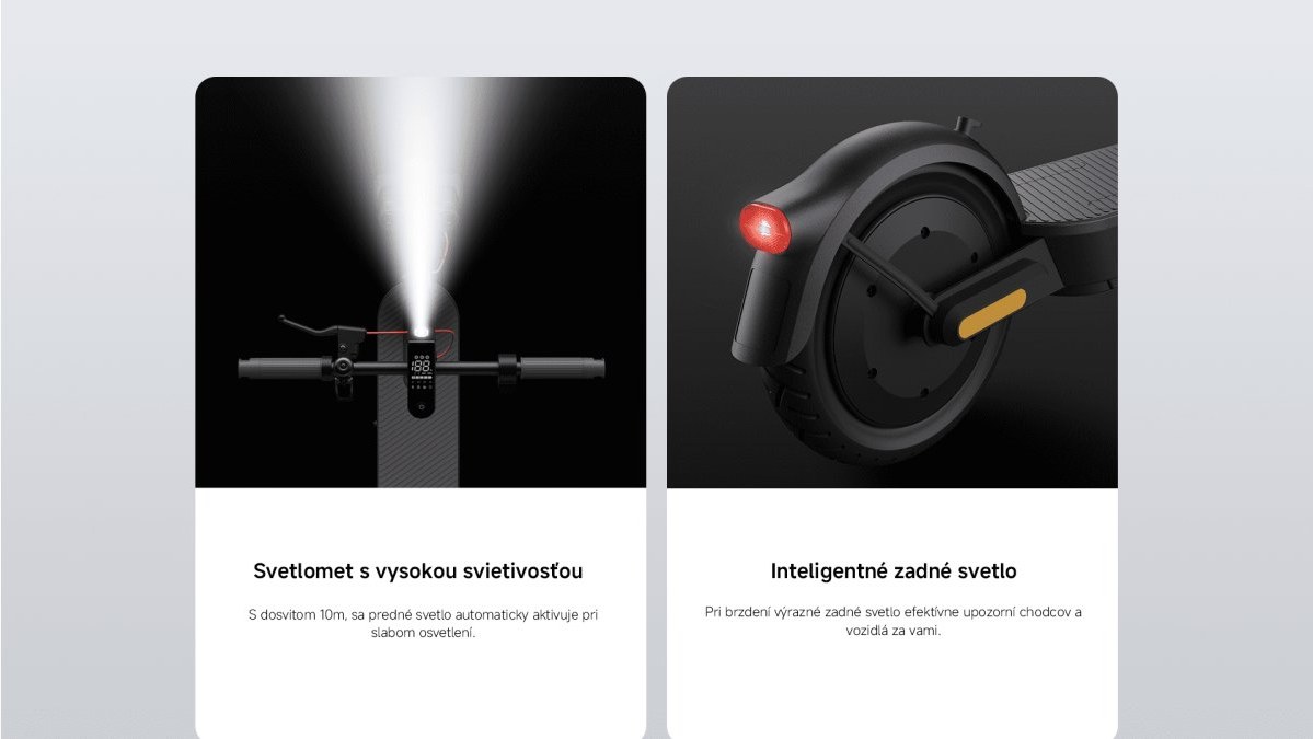 Kolobežka využíva optické senzory snímajúce okolité osvetlenie, ktoré za zhoršených svetlených podmienok automaticky aktivujú osvetlenie, čím zabezpečuje vašu bezpečnosť za každých okolností. Je vybavená predným svetlometom s vysokou svietivosťou, ktorý poskytuje efektívne osvetlenie až na vzdialenosť 10m a inteligentným zadným svetlom pre signalizáciu vozidlám a chodcom idúcimi za vami.Duálny brzdový systém pre dvojnásobnú bezpečnosť.