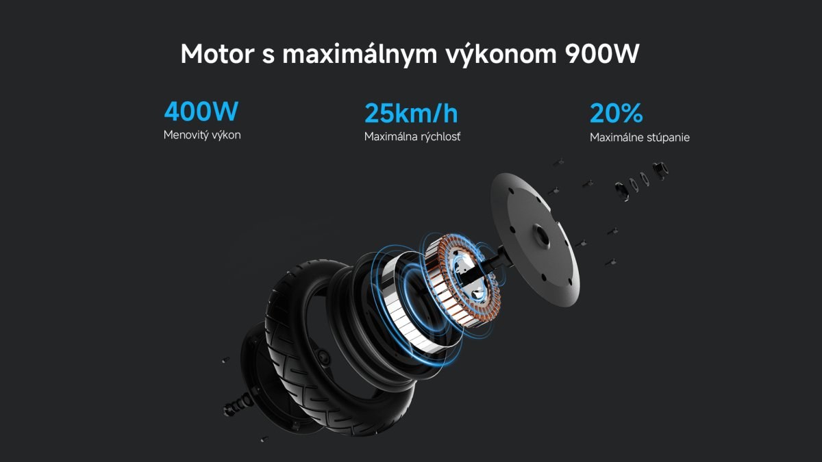 Vďaka vysokovýkonnému bezkefovému motoru nebude ani jazda do strmého kopca žiaden problém. Motor dokáže dosiahnuť maximálny výkon až 900W, rýchlosť 25km/h a poradí so stúpaním až do 20%. *S váhou 75kg a batériou nabitou aspoň do 70% (±10 %) kolobežka úspešne zvládla stúpanie so sklonom 20% pri rýchlosti 15km/h. Po prekonaní 10m úseku svahu, rýchlosť na vrchole presiahla 6 km/h. Údaje boli testované výrobcom.Viacero jazdných režimov
