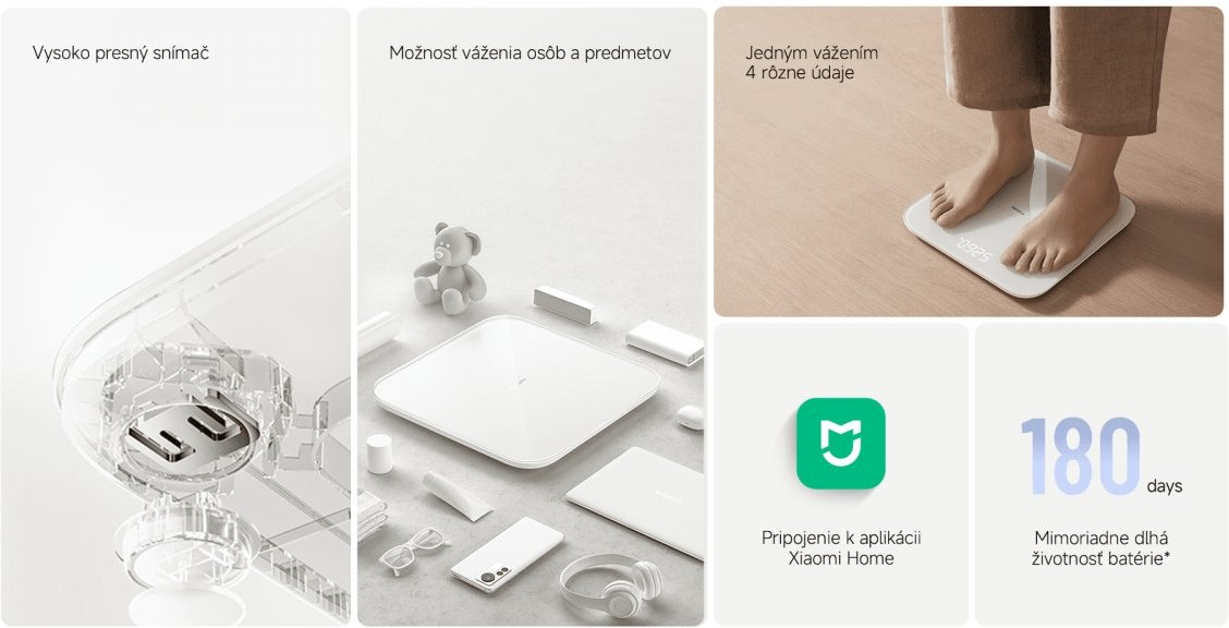 Univerzálna domáca váha na váženie ľudí aj predmetov. Jedným vážením poskytne až 4 rôzne údaje a vydrží až 180 dní. Váhu môžete pripojiť k aplikácii Xiaomi Home.Snímač s vysokou presnosťou