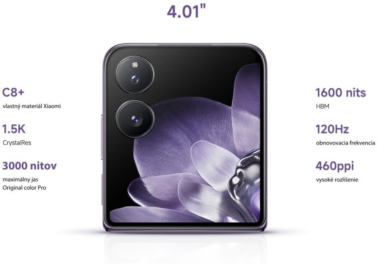 Xiaomi Mix Flip ponúka špičkový a unikátny 4.01” vonkajší displej pre dokonalý zážitok z jeho používania. Samozrejmosťou je vysoká obnovovacia frekvencia 120Hz, vysoká svietivosť až 3000 nitov, či vysoké rozlíšenie 1.5K. Po rozložení na vás čaká 6,86“ vnútorný displej rovnako vizuálne pôsobivý ako ten vonkajší a prináša pôsobivé vizuálne efekty, ale aj ochranu vašich očí vo forme certifikácie TÜV Rheinland – nízkej úrovne modrého svetla.