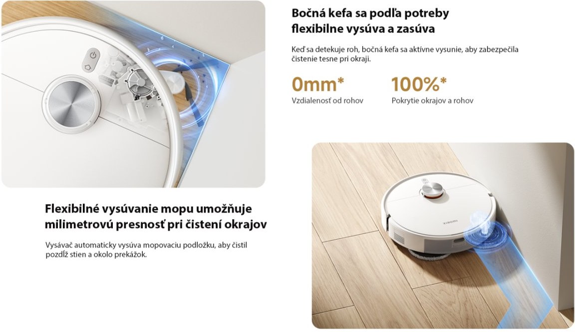 Duálne mechanické ramená dynamicky vysúvajú a zasúvajú bočnú kefu a mopovaciu podložku, aby účinne čistili pozdĺž okrajov a v rohoch.Výkonné sanie s výkonom 15 000 Pa