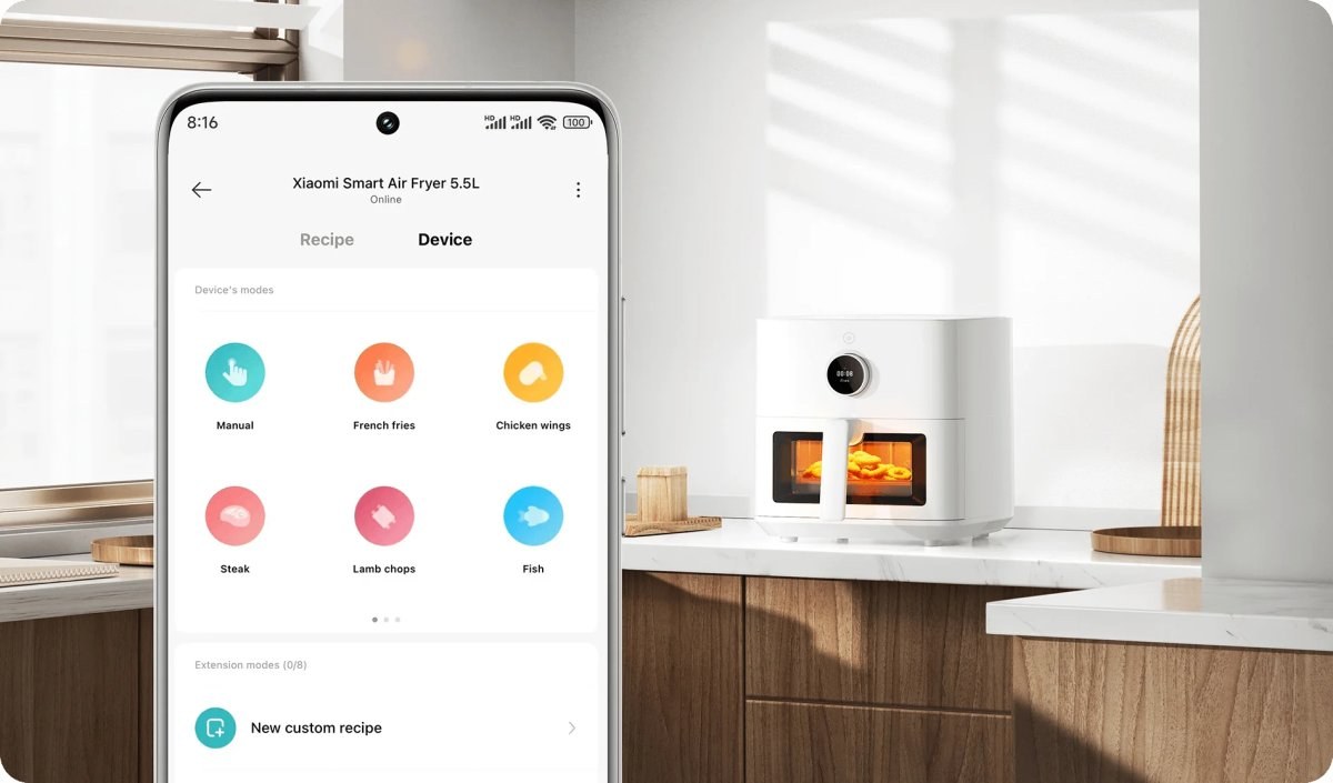 Vďaka pripojeniu k aplikácii Mi Home/Xiaomi Home získate prístup k viac ako 100 receptom, ktoré vám pomôžu pripraviť zdravé a chutné pokrmy pre celú rodinu. Hlasové ovládanie prostredníctvom služby Google Assistant zjednodušuje interakciu s prístrojom a umožňuje vám ovládať fritézu aj keď máte plné ruky. Zdravotne nezávadný nepriľnavý povrch zaisťuje, že čistenie po použití bude rýchle a jednoduché, čo je ďalším plusom pre zaneprázdnené domácnosti.