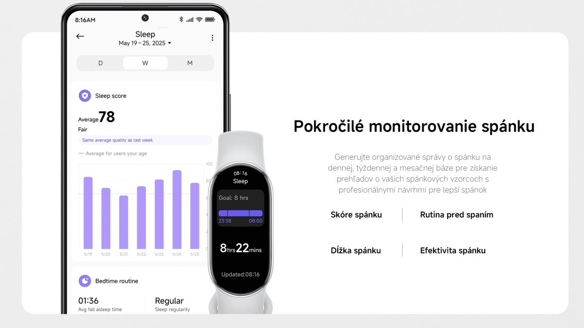 Vďaka presným snímačom môžete svoj spánok sledovať presnejšie ako kedykoľvek predtým. Náramok vám poskytne individuálne odporúčania a riešenia na optimalizáciu kvality vášho spánku. Na základe predošlých údajov o spánku vám vygeneruje inteligentný 21-dňový plán na optimalizáciu spánku. *Plán inteligentného zlepšenia spánku je potrebné aktivovať manuálne.21-dňová výdrž batérie