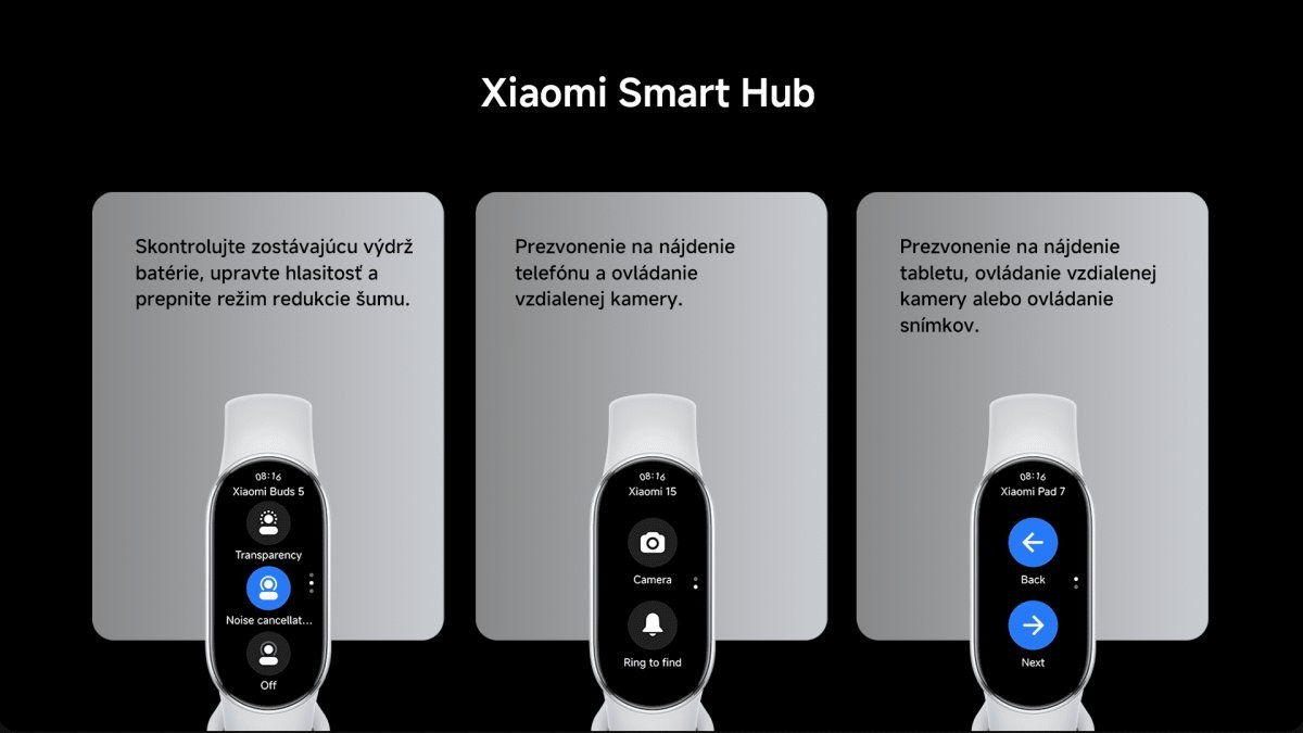 Ovládajte svoje slúchadlá, smartfón aj tablet priamo z náramku. Zjednodušte si každodenné úlohy vďaka plynulému prepojeniu nášho ekosystému. *Ak chcete používať funkciu Xiaomi Smart Hub, náramok musí byť pripojený k smartfónu alebo tabletu Xiaomi podporujúcim najnovšiu verziu Xiaomi HyperOS 2 a s najnovšou verziou aplikácie Mi Fitness. *Funkcia je spočiatku kompatibilná so zariadeniami Xiaomi Buds 5 Pro, Xiaomi Buds 5, Xiaomi Buds 4 Pro, Xiaomi OpenWear Stereo, Redmi Buds 6 Pro, Redmi Buds 6 a ďalšími. Ďalšia dostupnosť tejto funkcie bude sprístupnená formou OTA aktualizácii.Technické parametre