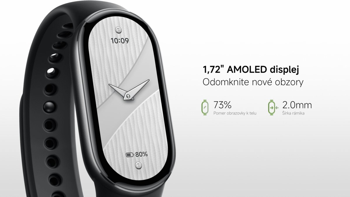 Vychutnajte si pohlcujúcejší zážitok zo sledovania, teraz s ešte vyšším jasom a tenším rámčekom displeja. Technológia hermetického utesnenia vo vákuu, umožnila stenčenie rámčekov po celej ploche displeja a to len na 2.0mm, čím sa pomer obrazovky k telu zariadenia zväčšil zo 66% na 73%. *Xiaomi Smart Band 10 má displej v tvare pilulky, pričom uhlopriečka 1,72” je dĺžkou uhlopriečky teoretického obdĺžnika presahujúceho tvar pilulky.