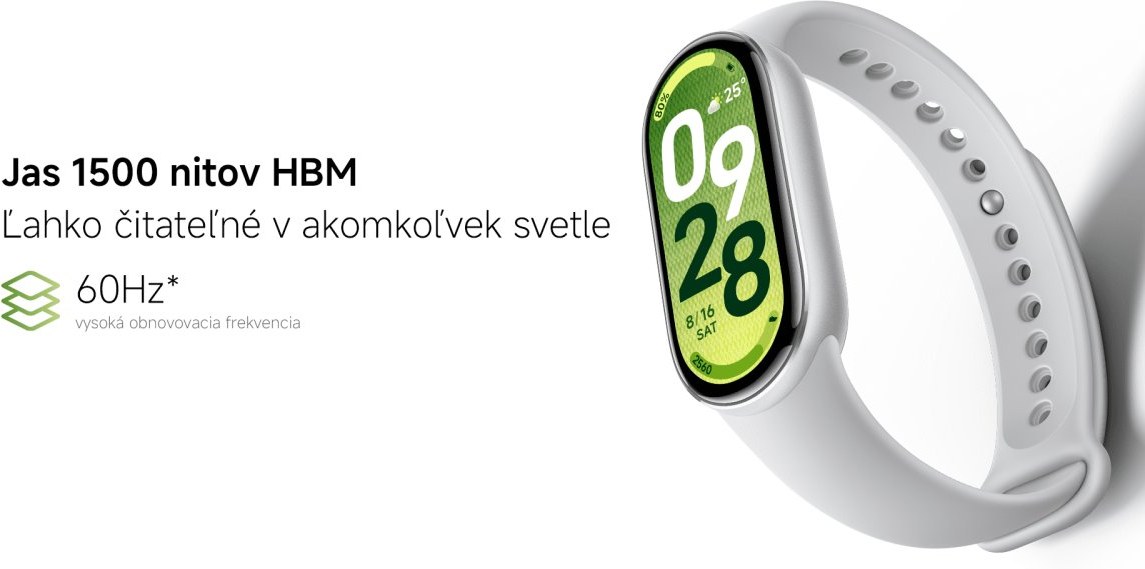Xiaomi Smart Band 10, dosahuje mimoriadne vysoký jas 1500 nitov, čo je o 25% vyšší jas displeja v porovnaní s predchádzajúcou generáciou. Vďaka tomu je každá správa, notifikácia či ikona čitateľná aj na priamom svetle.Prémiové kovové telo