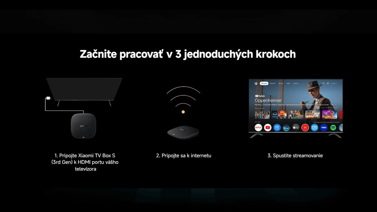 1. Pripojte Xiaomi TV Box S (3. generácie) k HDMI portu televízora2. Pripojte sa k internetu