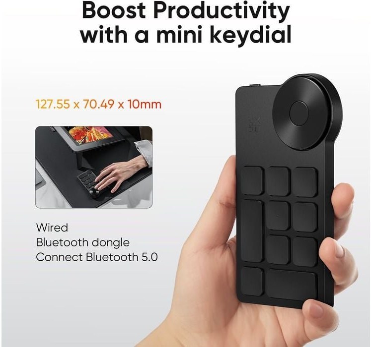 Model RC obsahuje v balení aj bezdrôtový ovládač Wireless Shortcut Remote (ACK05), čo je ovládač s číselníkom určený na programovanie klávesových skratiek do tzv. prispôsobených výrazových klávesov pre kresliaci tablet. Môžete ho pripojiť bezdrôtovo prostredníctvom rozhrania Bluetooth 5.0, kľúča Bluetooth alebo kábla USB-C. Celkovo 3 spôsoby pripojenia vám prinášajú stabilný a rýchly prenos, môžu tiež vyhovovať rôznym pracovným scenárom.Diaľkový ovládač má štíhly profil a váži len 75 g, takže sa ľahko drží jednou rukou. Vstavaná batéria s kapacitou 1000 mAh zabezpečuje nepretržitú prevádzku približne 300 hodín. Je pripravený urýchliť vašu tvorbu, kedykoľvek ho vezmete do ruky. Diaľkový ovládač obsahuje celkovo 10 tlačidiel a pre každé z nich si môžete prispôsobiť 4 sady klávesových skratiek, celkovo až 40 klávesových skratiek. Ak chcete prepínať medzi sadami, stačí stlačiť jedno tlačidlo. Jeho schopnosť pracovať s rôznymi aplikáciami z neho robí výkonný a produktívny nástroj nielen na tvorbu, ale aj na štúdium, prácu a hranie hier.