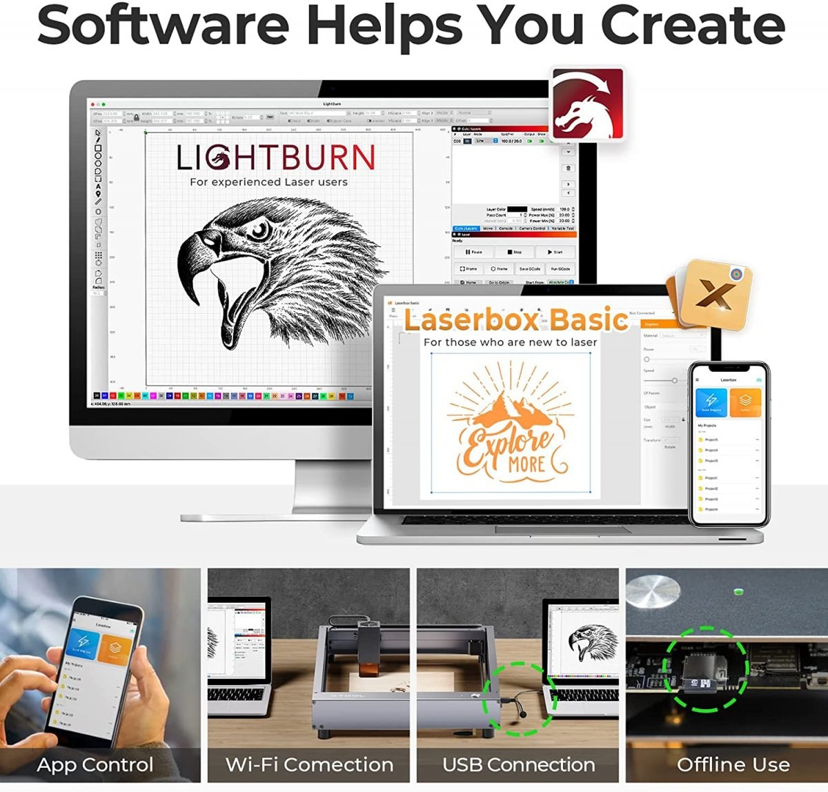 Software: Laserbox Software / Laserbox App / LightBurn