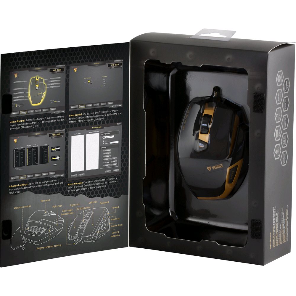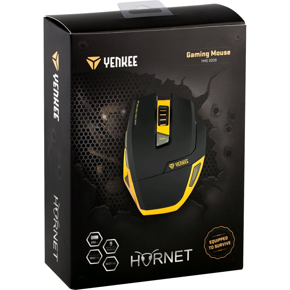 Herná optická myš HORNET YMS 3009 je určená pre pokročilých hráčov počítačových hier, ktorým záleží nie len na kvalite, ale aj na dizajne. O optimálny arzenál „na prežitie“ a jeho plné použitie počas misií sa stará celkovo 9 programovateľných tlačidiel, vrátane ergonomického „multi-fire“ tlačidla na pravom boku myši. Priložený ovládač (CZ/EN) umožňuje rozsiahle možnosti nastavenia. Je možné meniť nastavenie funkcií jednotlivých tlačidiel, nastavovať osvetlenie, vytvárať a editovať makrá. HORNET obsahuje internú pamäť 256 kB na uloženie až 5 herných profilov. Ďalej je možné nastaviť rýchlosť kurzora, rýchlosť dvojkliku, rýchlosť scrolovania, citlivosť osí X a Y atď. V neposlednom rade je možné meniť rozlíšenie snímača 400 až 3200 dpi a frekvenciu v rozsahu 125 až 1000 Hz. Hmotnosť myši je možné regulovať pridávaním alebo odoberaním 5 kusov závažia pod horným krytom. Dlhú životnosť zaručuje aj opletený kábel s pozláteným USB konektorom optimálnej dĺžky 1,8 m. LED indikácia nastaveného rozlíšenia snímača a decentné oranžové podsvietenie zaručujú maximálny zážitok aj pri používaní v tme.Tlačidlá: 9 programovateľných