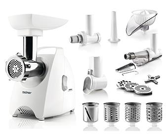 Mlynček na mäso ZELMER ZMM5580W s obojstranným nožom, tromi sitkami pre hrubé a jemné mletie, prídavným strúhač, citrusovačom, mlynčekom na mak, lisom na ovocie a plneným nástavcom.