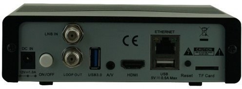 Na zadnom paneli sú: externý napájací konektor, vypínač ON / OFF vstup a výstup DVB-S2X tuneru, port USB 3.0, 3,5mm AV výstup, HDMI 2.0, ethernetový port 10 / 100Mbit, USB 2.0 port, reset tlačidlo slúži k nahrávaniu softvéru a prístup na kartu SDcard (TFcard) až do 128 GB.