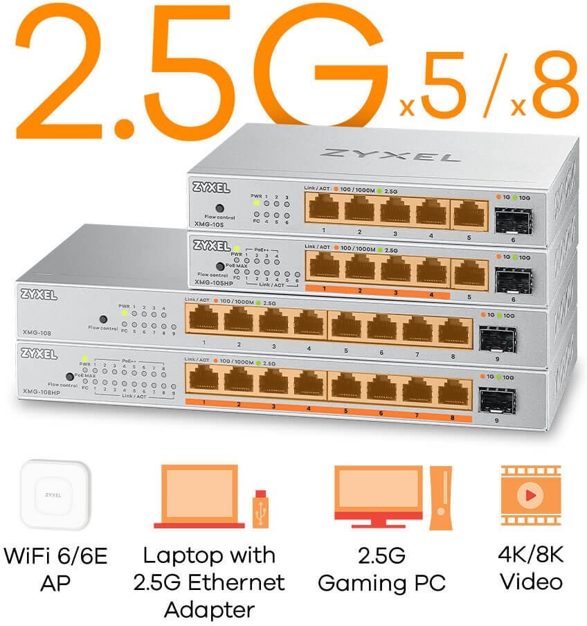 Séria 2,5 Gbps prepínačov XMG-100 obsahuje 5 a 8portové modely s možnosťou PoE alebo bez nej. Tieto prepínače sú vybavené multigigabitovými portami s podporou až 2,5 Gbps a možno ich ľahko pripojiť k najnovším sieťovým zariadeniam podporujúcim 2,5 Gbps vrátane prístupových bodov WiFi 6/6E, 2,5 Gbps CPE, 2,5 Gbps úložísk, 4K/8K TV, PC s 2,5 Gbps NIC a herných konzol. Táto zjednodušená technológia plug-and-play umožňuje vysoko výkonné sieťové pripojenie a plynulejší zážitok z domácej zábavy alebo tvorby multimédií.
